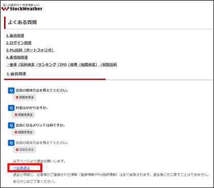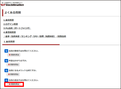 ② 「1.会員関連」セクションにある「Q.会員の退会方法を教えてください。」の「回答を見る」ボタンをクリック