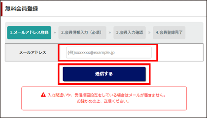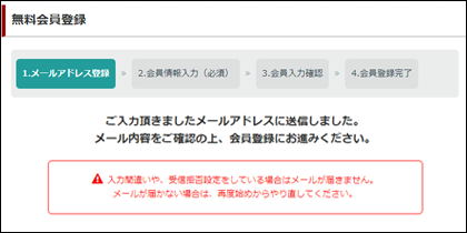 ④ 下左の画面が表示されたら、②で入力したメールアドレスに、会員登録の案内メールが届きます。