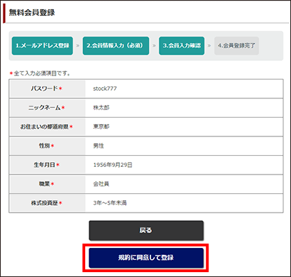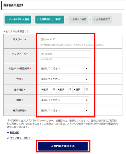 ② 入力を終えたら「利用規約」「プライバシーポリシー」をご確認の上、「入力内容を確認する」をクリック