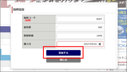 「銘柄コード」「保有数」「取得単価」「購入日」を入力